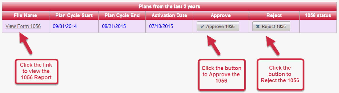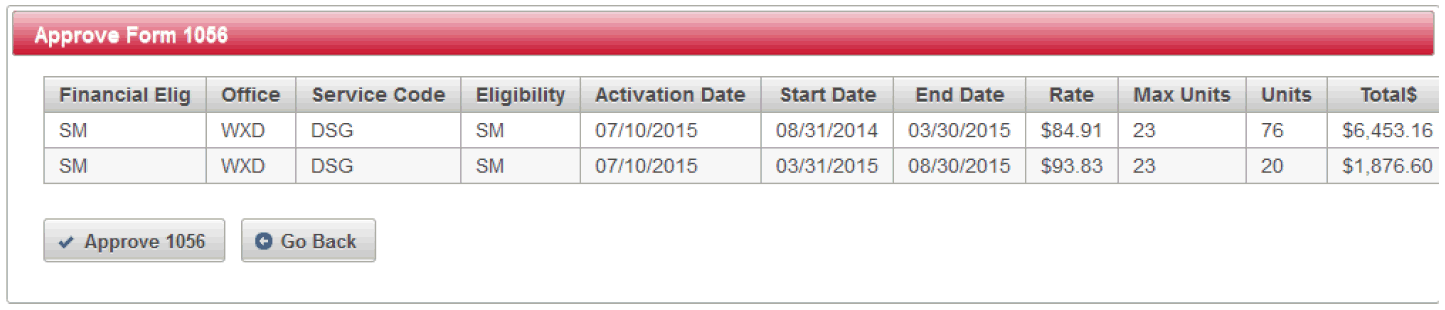 NOTE: a Form 1056 can be either approved or rejected. However, both decisions cannot be recorded simultaneously. Each form represents a change activated in the plan. The Form 1056 is required only when a "material" change is made to the plan- meaning the dates, rates, or units of service has changed.
