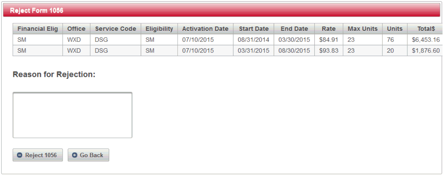 b. To finalize the rejection process, write a comment about why the service code(s), amount and/or duration are inaccurate. Click the "Reject 1056" button